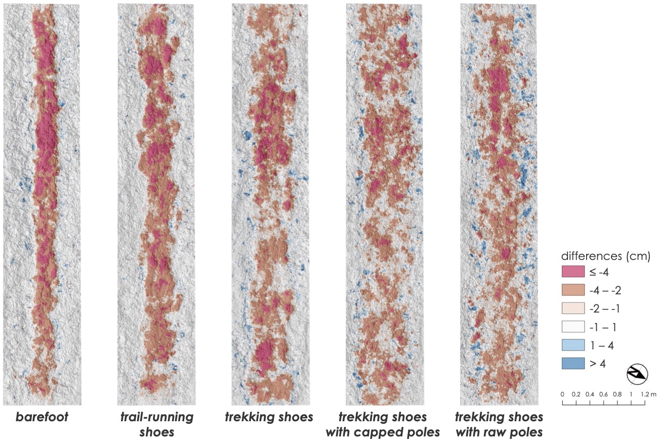 トレイルサーフェスの変形実験に関する論文がEnvironmental Challenges誌(Elsevier, CiteScore=8.0)に掲載されました。 Hayakawa, Y.S., Gomez, C., Watanabe, T., Wang, T., Kobayashi, Y., Inomata, M., Sakai, T., Imagawa, S. (2025.04) Effects of ground-contacting gears on trail surface deformation from trampling. Environmental Challenges, 18, 101107. https://doi.org/10.1016/j.envc.2025.101107 登山者が使う用具には、さまざまな靴やポールなどがあり、登山者の手助けとなっていますが、それらが登山道の侵食に与える影響にはどういった違いがあるのでしょうか。本研究では、異なる用具が登山道の侵食に与える影響を実験的に評価しました。SfM写真測量などの高度な3D地形計測手法を用いることで、登山道路面の変形の詳細な定量化が実現しました。素足(裸足)での踏みつけは、靴を履いた場合と比較して、足跡の深さや横方向の広がりが最小限であることが確認されました。また、比較的柔らかい靴底のトレイルランニングシューズよりも、硬い靴底の登山靴の方が、土の凹みが大きくなりました。一方、トレッキングポールの使用は、土壌の横方向への拡散を大幅に増加させ、登山道の侵食を加速させる可能性があることが示されました。 実験の様子
