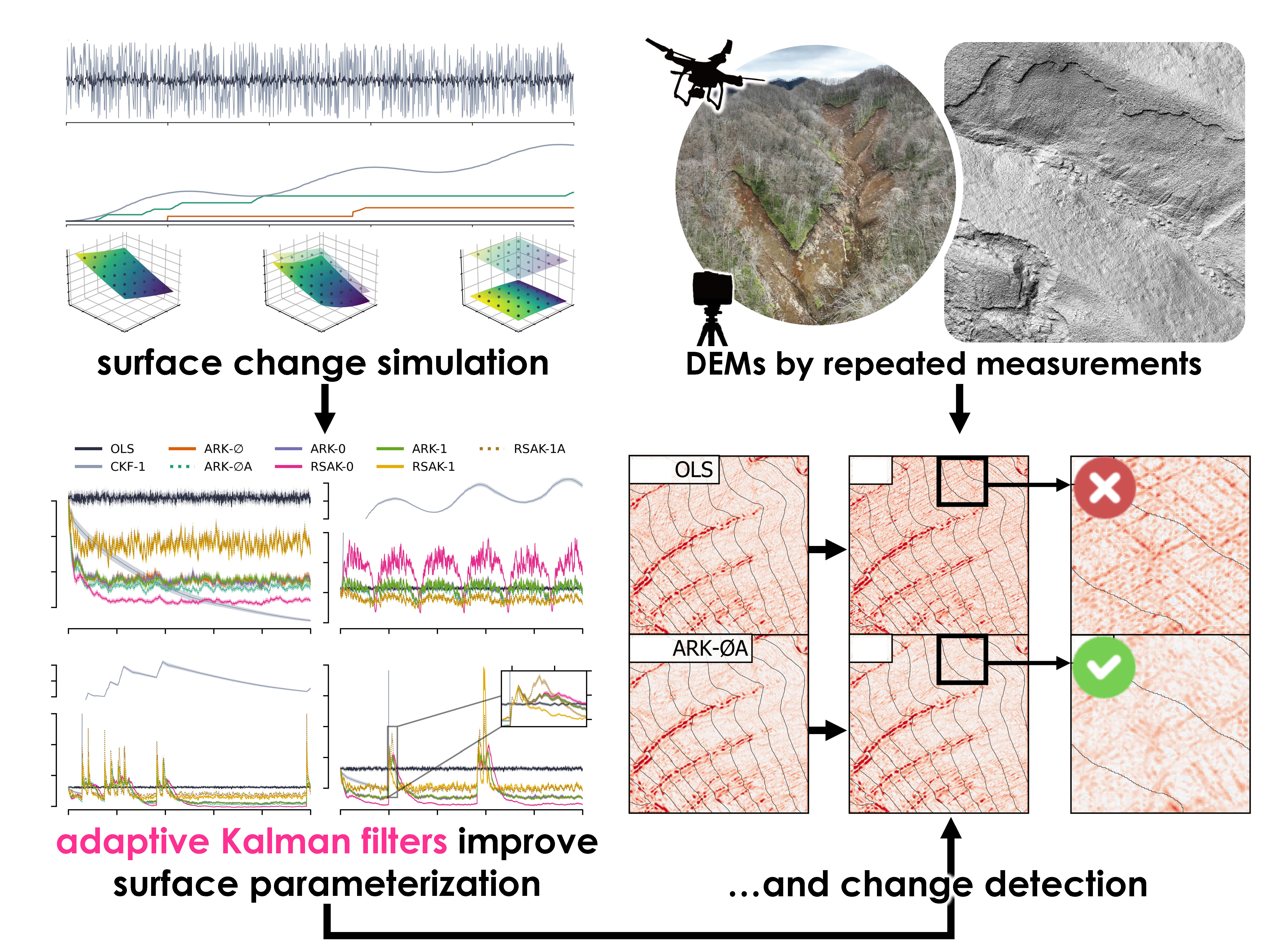 JSPS外国人特別研究員のNewmanさんと早川の共著論文が、Remote Sensing誌(JIF=4.2、CiteScore=8.6)に掲載されました。地形調査における精度向上に関する学術論文です。 Newman, D.R., Hayakawa, Y.S. (2025.06) Robust land-surface parameterisation for repeated topographic surveys in dynamic environments with adaptive state-space models. Remote Sensing, 17 (12), 1993. https://doi.org/10.3390/rs17121993 この研究では、カルマンフィルタという統計的手法を適応的に利用することで、地形の表面モデルの推定精度を高める方法を評価しています。とくに、無人航空機(UAS)等による高頻度な地形データ収集が増加する中で、データの誤差なのか本当の変化なのか?を区別するために、繰り返し観測から得られる情報を最大限に活用して、地形表面とその変化をより正確に評価することを目指しています。ここでは、シミュレーションを通じて、適応型カルマンフィルタが、従来の最小二乗推定器に比べて誤差を大幅に削減できることを示しました。これは、地表の変化を追跡する上で、堅牢で有効な手段となることを支持しています。