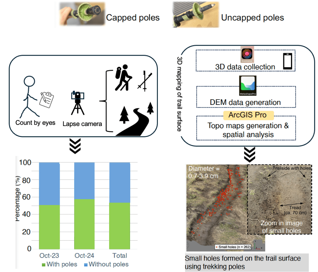 調査の結果、登山者の53.6%がトレッキングポールを使用していて、ポール使用者のうち約59.2%がキャップなしのポールを使用していることが明らかになりました。キャップなしのポールは登山道表面に多数の小さな穴(直径0.7 ~3.9 cm)を生じさせ、ポストモンスーンシーズンに地盤が緩んだ状態では土壌侵食を促進する要因となっています。さらに、キャップなしポールの影響により、登山道周辺の植生分布も顕著に変わっていることが明らかになりました。