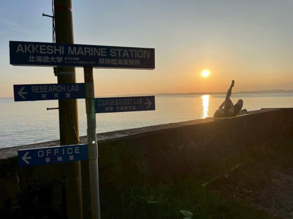 「一日の疲れを癒すために夕日をバックにピラティスを行った時の瞬間です。景色も綺麗で心も癒され、体もほぐされる最高の時間なので、皆さんも厚岸臨海実験所に行った際はぜひ!」